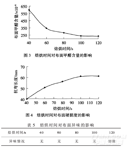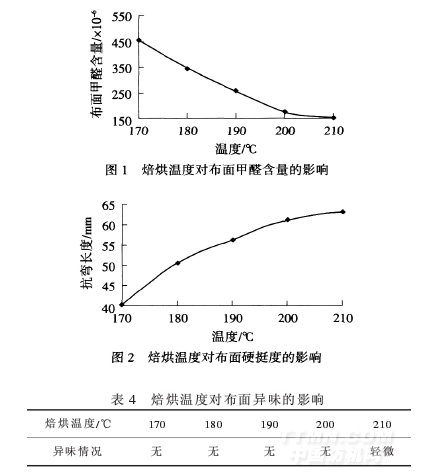 從圖1、圖2和表4可以看出,隨著焙烘溫度的升高,布面硬挺度明顯增加,甲醛含量隨之減小,當焙烘溫度升至210℃時,焙烘后布面有輕微的異味出現(xiàn).結(jié)合工廠應(yīng)用情況,建議工廠將焙烘溫度設(shè)定在190~200℃.