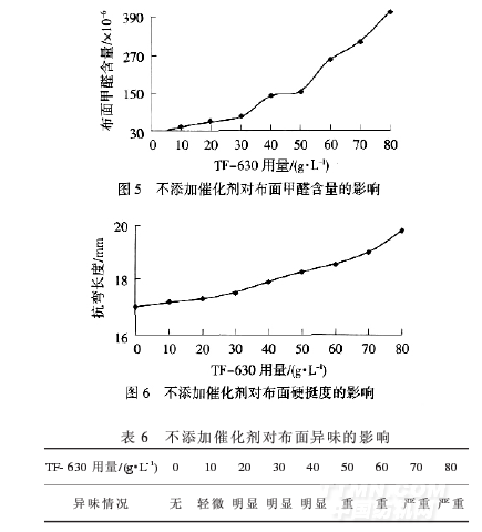 從圖5、圖6和表6可以看出,在常規(guī)工藝條件下,單獨用TF-630進行整理時,TF-630用量越多,布面游離甲醛含量越高,布面異味也越重,而硬挺度提高不明顯.原因是雖然TF-630在高溫、紅外線等作用下,不需固化劑也能固化完全,但需要較長的反應(yīng)時間,在工廠的常規(guī)工藝條件下,TF-630反應(yīng)很不完全.所以,建議工廠在采用TF-630整理的同時選用合適的催化劑,使TF-630在較短時間內(nèi)固化完全.