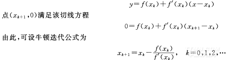 牛頓迭代法原理 :曲線y=f(x)與x軸的交點xm就是方程的根,設(shè)xk是它的一個近似根,過曲線y=f(x)上的點Pk [xk,,xk )]作切線與x軸的交點xk+1,切線方程為