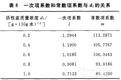 根據(jù)最小誤差平均值法和已知數(shù)據(jù),可求得一次項(xiàng)系數(shù)l和常數(shù)項(xiàng)系數(shù)m與活性藍(lán)染料質(zhì)量濃度d1的關(guān)系,如表5所示。