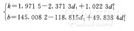 根據(jù)最小誤差平均值法和已知數(shù)據(jù),可求得一次項(xiàng)系數(shù)k值和常數(shù)項(xiàng)系數(shù)b值與活性藍(lán)染料質(zhì)量濃度d1 的關(guān)系,如表4所示。