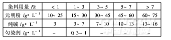 根據(jù)顏色深淺確定鹽(元明粉)用量。一般淺色10~30g/L,中色40~70g/L,深色70~100g/L,可用Na2CO3、Na3PO4調(diào)節(jié)pH值至10~11。