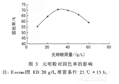 活性染料冷軋堆染色中,加入中性電解質(zhì)可起到促染作用。元明粉用量對(duì)固色率的影響見(jiàn)圖3。
