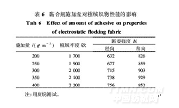黏合劑的主要作用是連接絨毛和底布,其施加量直接影響植絨織物的植絨牢度、斷裂強(qiáng)度、透氣性和手感等。在焙烘溫度為155℃,焙烘時(shí)間為5min的條件下,研究黏合劑施加量對(duì)植絨織物植絨牢度和斷裂強(qiáng)度的影響,結(jié)果如表6所示。