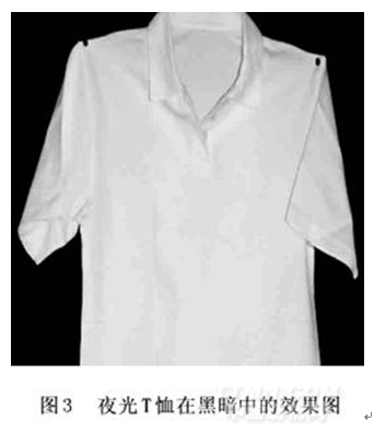 夜光纖維制成的紡織品在白天與普通纖維具有完全一樣的使用性能,不會(huì)使人感到有任何特異之處。更重要的是,它的發(fā)光成分已經(jīng)分散于纖維分子之中,發(fā)光特性不會(huì)受水洗的任何影響。圖3所示為針織T恤在黑暗中的效果圖,該T恤由白色夜光纖維制成。