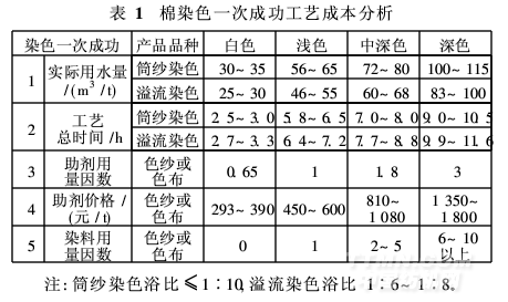 染色一次成功是指能有效控制每批染色產(chǎn)品在生產(chǎn)過程中一次就滿足客戶對(duì)質(zhì)量和數(shù)量的要求,而不需要采取任何加色、回修、返修的“零缺陷”工藝技術(shù)。以常見的棉織物染色分析為例,實(shí)現(xiàn)染色一次成功時(shí)的用水、時(shí)間、助劑和染料用量如表1。