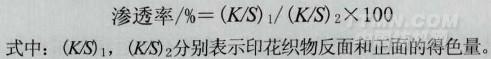 用SF600X Datacolor計(jì)算機(jī)測(cè)色配色儀測(cè)定印花后織物正反面K/S,然后用下列公式計(jì)算: