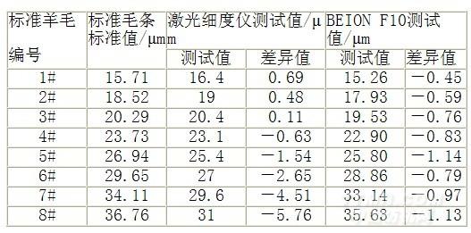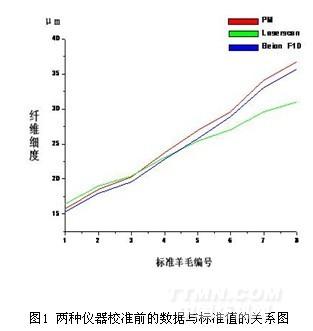 將8組標(biāo)準(zhǔn)毛條分別用LASERSCAN激光細(xì)度測定儀和BEIONF10全自動細(xì)度儀進(jìn)行測試。得到的結(jié)果見表1,兩種儀器校準(zhǔn)前的數(shù)據(jù)與標(biāo)準(zhǔn)值的關(guān)系圖見圖1。