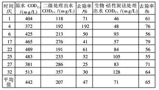 由表2可知,隨著時(shí)間的延長(zhǎng),生物處理作用得到發(fā)揮,通過生物膜的生物作用和再生作用,CODCr去除率逐漸穩(wěn)定在60%左右,出水CODCr穩(wěn)定在100mg/L以下。通過顯微鏡觀察,可以看到一些菌膠團(tuán)和滴蟲、草履蟲、鐘蟲等在活性炭表面已形成生物膜。在生物膜對(duì)有機(jī)物降解過程中,起主要作用的微生物是異養(yǎng)菌、原生動(dòng)物和后生動(dòng)物[3]。