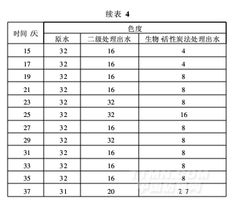 由表4可見,在掛膜階段,生物-活性炭出水色度一直較低,處理效果較好?;钚蕴繛榉菢O性吸附劑,根據(jù)極性相同物質相互親合的原理,活性炭能選擇性地從水中吸附非極性和弱極性物質,因而對水中的染料等有色物質有較強的吸附能力。