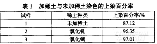 (1)分別改變稀土種類和稀土的用量,觀察其對染色性能的影響。按上面所述工藝進(jìn)行染色實(shí)驗(yàn),在染色進(jìn)行到一半時(shí)分別加入氯化釓和氯化鑭稀土溶液,實(shí)驗(yàn)對比兩種稀土的上染百分率。加稀土和未用稀土染色的上染百分率對比如表1所示。