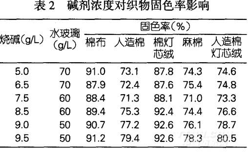 由表2可知采用燒堿與水玻璃混合堿劑,一方面保證染液有足夠高pH值,使活性染料固色反應(yīng)有足夠快的速率;另一方面,由于水玻璃的緩沖作用,使染液pH相對(duì)穩(wěn)定,提高了勻染效果。水玻璃用量大,緩沖能力大,固色率也增大。但水玻璃濃度過(guò)大,會(huì)增大染液粘度反而會(huì)降低固色率。因此,混合堿劑的用量一般可確定為燒堿5~]0g/L,水玻璃50~70g/L。