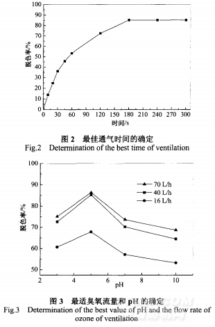 在臭氧通氣時(shí)間為3 min,反應(yīng)溫度為20℃,活性藏青廢水 初始濃度為10 mgm的條件下,確定臭氧的最佳流量和最佳pH, 結(jié)果如圖3所示。由圖3可見(jiàn)pH對(duì)處理效果有重要影響,最佳 pH為5左右,臭氧流量為70 L 時(shí),色度去除率達(dá)到86.7%。 臭氧流量對(duì)處理效果也有影響,當(dāng)流量增大時(shí),出水的吸光度不 斷變小,印染廢水的色度去除率不斷增大。當(dāng)流量大于40 L/h, 色度去除率的增加不是那么明顯,考慮到實(shí)際處理印染廢水的情況,不但要有效果,還有經(jīng)濟(jì)實(shí)用,綜合考慮選擇臭氧流量為40L/h。