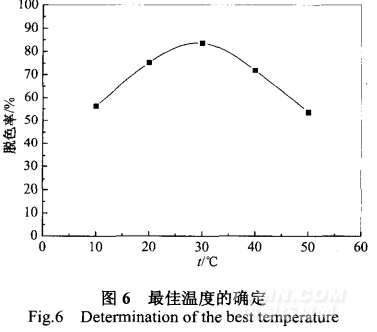 在三氯化鐵投加量為200 mg/L,皂土投加量為1 g/L,pH為 7,活性藏青廢水初始濃度為10 mg/L的條件下,考察混凝溫度對 處理廢水過程的影響,結(jié)果如圖6所示。由圖6可見反應(yīng)溫度由 10℃增高至50℃,色度的去除率逐漸增加,但增幅不大;溫度 高于30℃后去除率反而下降。這可能是因為適當(dāng)?shù)臏囟瓤梢约铀?反應(yīng)。溫度升高,反應(yīng)速度加快,使得去除率提高,但也會抑制 三氯化鐵的作用,溫度越高三氯化鐵越難發(fā)揮作用,導(dǎo)致脫色率 下降J。本試驗表明在10-50℃的較寬溫度范圍內(nèi)脫色率能夠達(dá) 到滿意的降解效果,故本試驗中溫度控制在30℃左右,色度去除 率可達(dá)到86.3%。