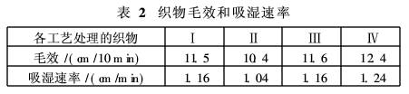 采用毛吸高度的測(cè)試進(jìn)行對(duì)比測(cè)試,操作如下:將Ⅰ、Ⅱ、Ⅲ、Ⅳ樣布,沿經(jīng)、緯向分別裁取30 cm×2. 5 cm的試樣,室溫放置24 h后,用不銹鋼小夾子將各試樣兩頭(窄邊)平行固定在兩根玻璃棒上,其中一根固定在水槽兩側(cè)的支架上,另一根浸沒于水中,水溫為25~27℃。10 min后測(cè)定毛效,取經(jīng)緯向平均值,計(jì)算吸濕速率(見表2)。