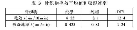 由表2知,采用染色和吸濕排汗同浴整理的織物,經(jīng)還原清洗后,其毛效較毛坯差,說明還原清洗對(duì)織物的吸濕排汗性能有一定的影響,這與其擴(kuò)散性能的測(cè)試一致。成品毛效的平均值為12. 4 cm,吸濕速率則為1. 24 cm/min,符合日本JISK0050檢測(cè)標(biāo)準(zhǔn)(該標(biāo)準(zhǔn)要求毛效10 cm為合格, 12 cm為良好)。將DTY針織物、純滌針織物和純棉針織物進(jìn)行毛