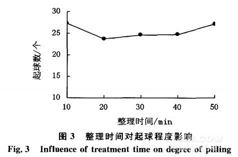 從圖3可以看出,整理時間對織物起球程度也有一定的影響.整理時間短,織物潤濕不充分,不能在織物表面形成樹脂膜,則達不到減少起球數的效果;整理時間過長,整理效果改善不明顯,且整理后試樣表面膜厚而不均勻,成本加大,不利于實踐應用.整理時間優(yōu)選為20~40rain.