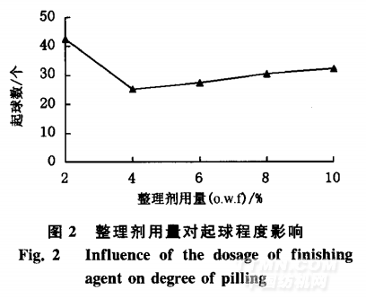 從圖2可以看出,加入整理劑后,織物起球數減少,但當溶液中整理劑達到臨界濃度后,起球數趨于飽和,甚至有增加趨勢.原因是加入整理劑后,紗線表面形成一層薄膜,束縛了纖維頭端,使纖維之間的抱合更加緊密,當整理劑同纖維之間的交聯(lián)趨于飽和,成膜的強度也趨于極限值,增加整理劑用量,對整理效果影響不大.故整理劑用量(o.w.f)適宜范圍為3~5.