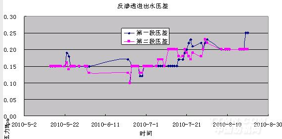 圖3 反滲透運行壓差從圖3中可知反滲透系統(tǒng)的原始壓差在0.15-0.20Mpa左右,經(jīng)過3個半月左右的運行,壓差上升到在0.02-0.25Mpa左右,壓差增加了30%左右,需要進(jìn)行化學(xué)清洗。采用自制的清洗藥劑進(jìn)行清洗后,跨膜壓差穩(wěn)定在0.2Mpa。從上圖可以看出隨著原水水質(zhì)的波動,電導(dǎo)率不同造成進(jìn)出水壓差存在較大的波動,但是整體壓差在3個月的時間內(nèi)穩(wěn)定上升。