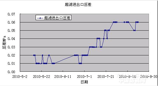 從表中可知超濾系統(tǒng)的原始壓差在0.01Mpa左右,經(jīng)過3個半月左右的運行,壓差上升了0.05Mpa,未達(dá)到清洗的跨膜壓差,還是在正常情況下,不需要進(jìn)行化學(xué)清洗。
