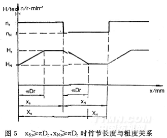 上述有關(guān)竹節(jié)長度、基紗長度計(jì)算公式可作為竹節(jié)參數(shù)設(shè)置的依據(jù),但是它們之問的不同組合將會(huì)產(chǎn)生不同粗度和形態(tài)的竹節(jié),以下分三種情況予以討論。為討論方便,不考慮伺服升降速過程,并假定竹節(jié)設(shè)置粗度不變。
