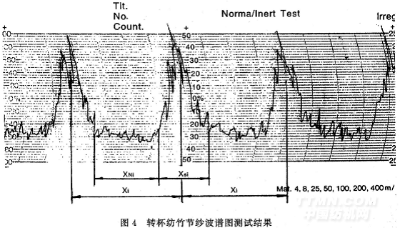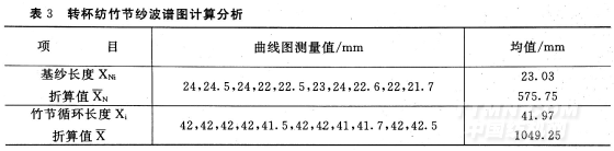 表3為上述紡紗品種與條件下,基紗設(shè)置長度840mm,竹節(jié)設(shè)置長度210mm一只竹節(jié)循環(huán)竹節(jié)紗,用烏斯特曲線圖測量法(見圖4)所測得的實(shí)際基紗長度XNi和循環(huán)長度Xi值。