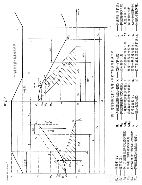 公式(25)、(26)、(27)表明,實(shí)際竹節(jié)長度是竹節(jié)設(shè)置長度、轉(zhuǎn)杯周長和伺服降速延遲長度之和;(緊接著的下一只)基紗長度為該基紗設(shè)置長度與轉(zhuǎn)杯周長和上一只竹節(jié)伺服降速延遲長度之差;一只完整的竹節(jié)循環(huán)長度是竹節(jié)長度和(緊接著的)基紗長度之和。由上述分析可知,伺服電機(jī)的升速過程不影響竹節(jié)的總長度,但它縮短了竹節(jié)粗度值紡紗長度(當(dāng)xs>x1)時(shí),并使得基紗→竹節(jié)轉(zhuǎn)換初期的竹節(jié)粗度增加變得更為平緩。伺服電機(jī)的降速過程會(huì)增加竹節(jié)的總長度和縮短下一只基紗紡紗長度,并使得竹節(jié)一基紗轉(zhuǎn)換初期竹節(jié)粗度下降趨緩,這在一定程度上補(bǔ)償了因伺服升速延遲使竹節(jié)粗度值紡紗長度的縮短。