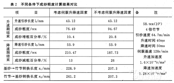 表2是根據(jù)以上推導(dǎo)公式,對(duì)紡58.3tex(10s)4倍竹節(jié)紗,引紗速度64.7m/min,伺服升速時(shí)間40ms,降速時(shí)間50ms時(shí),計(jì)算得出的伺服升降速結(jié)束時(shí)成紗粗度與不考慮伺服升降速因素成紗粗度的對(duì)比結(jié)果。由表2可見,因伺服升降速因素的存在,基紗與竹節(jié)轉(zhuǎn)換初期成紗粗度變化更為平緩,其基紗與竹節(jié)轉(zhuǎn)換長度都有所延長。