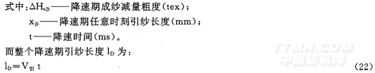 由公式(20)、(21)可知,在整個(gè)伺服降速期內(nèi)竹節(jié)粗度呈兩次函數(shù)遞減變化。從D點(diǎn)起伺服電機(jī)降速完成進(jìn)入紡基紗低速給棉。正如以上成紗原理分析所述,由于此時(shí)轉(zhuǎn)杯凝聚槽內(nèi)還殘留著降速期結(jié)束時(shí)的HsD高量纖維層,要實(shí)現(xiàn)基紗粗度紡紗,必須待它們完全被剝離,即再經(jīng)過一個(gè)轉(zhuǎn)杯周長的引紗才能徹底完成這種切換。所以,實(shí)際竹節(jié)一基紗轉(zhuǎn)換結(jié)束點(diǎn)延遲到C′N,而非不計(jì)伺服降速過程時(shí)的CN點(diǎn)。這兩點(diǎn)間的引紗長度即為伺服降速延遲長度AC,其值為: