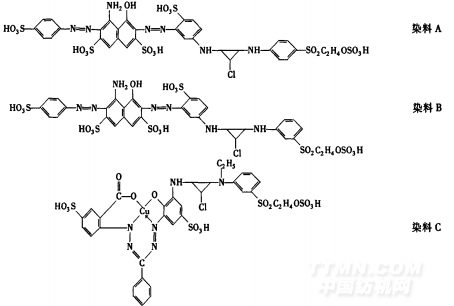芳綸織物經(jīng)過丙酮、蒸餾水清洗,80℃烘干后置于GPT一3型等離子體處理儀中,抽真空至l0Pa,充入染料的關(guān)系,可為活性染料拼混復(fù)配增效提供參考依據(jù).尚慶梅等合成了22個(gè)藍(lán)色活性染料。并測(cè)定了SERF值。從中拼混了雙組分復(fù)配染料2種,其一為相同類染料;其二為不同類染料。它們的SERF值比較接近,染料提升力有一定的提高。染料分子結(jié)構(gòu)式如下,三個(gè)染料的SERF值如表l0所示。