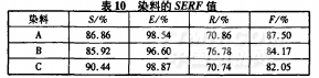 染料A和染料B是母體相同、封閉基不同的偶氮染料,A的封閉基為對(duì)位酯,B的封閉基為間位酯,屬同類染料的拼混。從表10可知,染料A和染料B的SERF值十分相近,當(dāng)二者以7:3混和后,在相同濃度下染色,表觀得色量比相應(yīng)單一染料的高,且隨染料濃度增加而明顯提高。當(dāng)染料濃度從0.5%(oWf)增至1%(owf)時(shí),表觀得色量可從9.3%增至33.81%。染料B和染料C屬不同類染料問的拼混,染料B為偶氮類染料,染料C為甲厝類染料。兩者SERF值相近,當(dāng)以9:l混合后染色,在染料濃度1%時(shí),混合染料染色的表觀得色量比單一B染料高21.22%,大大提高了染料的染深性。