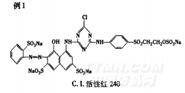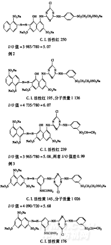染料的上染可以看作染料在染浴(親水相)和纖維(疏水相)兩相問的分配,所以活性染料的親水性和疏水性會影響它對纖維的吸附。重氮組分中的萘環(huán)取代苯環(huán)后,疏水性增加,UO下降;尤其是活性基以乙烯砜基代替硫酸酯乙基砜后,少了一個親水基團硫酸酯,UO相應下降。以三組染料為例,說明實際應用時如何計算活性染料UO值。