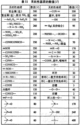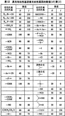 與有機性值相比,無機性值的確定就比較復雜。把醇類羥基的無機性值定為100,并以此為基礎,決定其它取代部分的數值。具體無機性值的數值列于表11,而有些基團有有機性值也有無機性值,其數值列于表12。