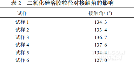 實驗發(fā)現(xiàn),未經(jīng)任何整理的空白滌綸試樣不具有拒水性能,測試條件下接觸角為0°;僅經(jīng)二氧化硅溶膠整理后的布樣,由于二氧化硅粒子表面存在孤立、連生和雙生等不同狀態(tài)的親水性羥基,接觸角也為0°;僅浸漬水解液的滌綸織物(試樣6)與水的接觸角可達(dá)到12710°;而先經(jīng)二氧化硅溶膠整理然后再浸漬水解液的滌綸布樣(試樣1~試樣5) ,接觸角均有提高,可達(dá)133°以上。這是因為經(jīng)過二氧化硅溶膠整理后,滌綸織物表面的粗糙度得到了提高,再經(jīng)自組裝后使拒水效果提升。該結(jié)論同Wenzel[10],Cassie和Baxter[11]等人建立的疏水表面粗糙度和接觸角之間的關(guān)系相一致。從表2中還可以看出,試樣1~試樣5與水的接觸角在13314°至13716°之間,可見粒徑分布在30~70nm的二氧化硅溶膠對整理后織物的接觸角影響不大。由于Sol4的多分散系數(shù)較小,且經(jīng)其整理的織物接觸角相對大些,故后續(xù)滌綸織物拒水整理研究選用Sol 4。
