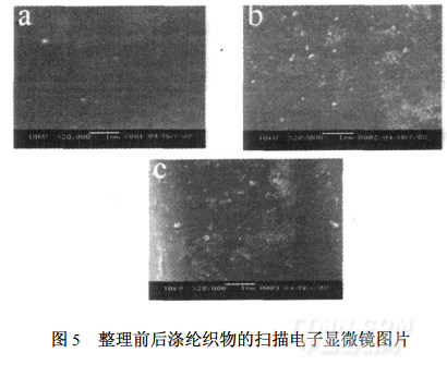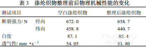 從表3可以看出,整理后滌綸織物的經(jīng)緯向強力略有下降,但變化不大。整理前后滌綸織物的白度、透氣性基本不變。由此可見,經(jīng)過上述整理不會影響滌綸織物的原有服用性能。