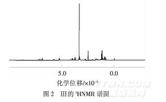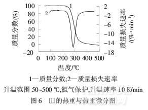 從圖6可以看出,Ⅲ的TG圖在測定的溫度范圍內(nèi)只出現(xiàn)了一個平臺,由其DTG圖可知,在測試溫度范圍內(nèi),只在289℃附近有一個很強的峰,說明它在此溫度下分解速率最快,可以判定其分解溫度約為289℃,說明該產(chǎn)物具有良好的熱穩(wěn)定性和良好的耐熱性.