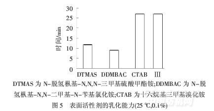 從圖5可以看出,與相應(yīng)的單子表面活性劑相比,濃度/(mmo·lL-1)Ⅲ具有更優(yōu)越的乳化能力,分出10 mL水的時間為27min,但與傳統(tǒng)的表面活性劑CTAB乳化能力相當.