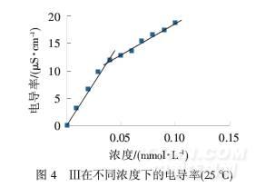 從圖4可知,Ⅲ的cmc約為3.6×10-5 mol/L.由此方法得出的結(jié)果與上述表面張力法得出的結(jié)果比較一致,比傳統(tǒng)表面活性劑值要低1~2個數(shù)量級,由可以充分說明該類表面活性劑的優(yōu)越表面性能.