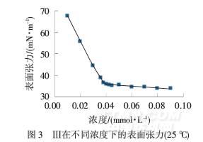 從圖3可知,Ⅲ的cmc約為3.8×10-5 mol/L,此時的表面張力(γcmc)約為36.8 mN/m.