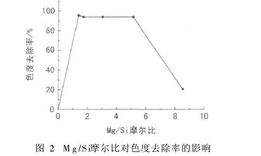 在500mL染色廢水中先加入20 g粉煤灰,再投加100 mg/kg不同Mg/Si摩爾比的聚硅酸鎂,以結果如圖2。