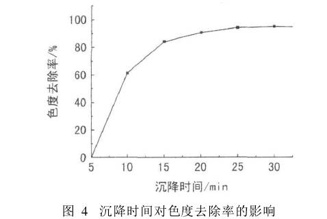 在聚硅酸鎂投藥量為100 mg/L、Mg/Si摩爾比為1. 36、粉煤灰加入量為5 g的條件下,不同沉降時間對色度去除率的影響如圖4所示。
