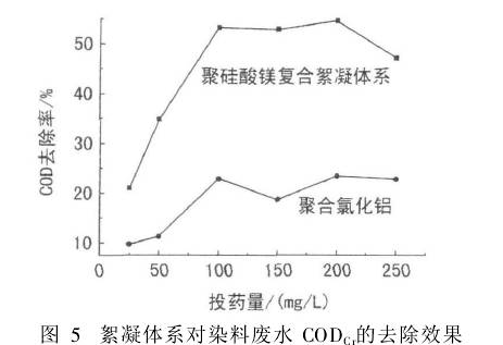 圖5表明,采用聚硅酸鎂復合絮凝體系處理印染廢水,CODCr去除效果優(yōu)于市售聚合氯化鋁,投藥量小,CODCr去除率高。