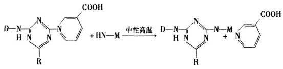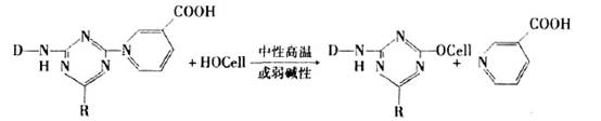 CN型中性活性染料是一種具有季銨型吡啶甲酸基團(tuán)(Quaternary Nicotinate)反應(yīng)基的三嗪型(Triazi-nyl)活性染料。在中性高溫(100~130℃)條件下,和纖維素纖維的反應(yīng)式如下: