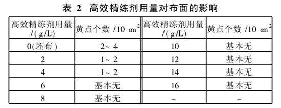 在直接漂白坯布時(shí)發(fā)現(xiàn),棉籽殼在膨化時(shí)會(huì)產(chǎn)生黃汁而沾污布面,烘干后會(huì)在布面上形成米粒大的黃點(diǎn)。為解決該問題,首先考慮選用有效的化學(xué)助劑,如高效精練劑,可起到分散黃汁、防止沾污的作用,高效精練劑的用量對漂白后布面黃點(diǎn)個(gè)數(shù)的影響見表2。