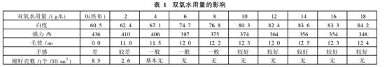 在前述的工藝流程和條件下,討論雙氧水用量對拉舍爾毯前處理效果的影響,如表1所示。