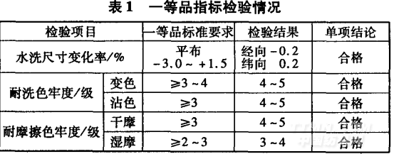 依據(jù)GB/T4l1_2o08《棉印染布》一等品指標(biāo)進(jìn)行檢驗(yàn),結(jié)果見表1。
