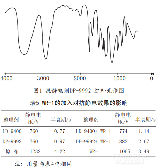 由表5知,WR-1的加入使得LD-9400、DP-9992抗靜電整理效果下降。由于WR-1的強(qiáng)極性而且分子量大,對(duì)纖維具有強(qiáng)親和力,所以WR-1會(huì)優(yōu)先吸附在纖維表面,而抗靜電劑靠疏水基吸附在拒水整理劑分子和纖維表面[4],因此同浴整理后可能會(huì)影響抗靜電劑在織物上的吸附量,同時(shí)可能由于拒水整理劑分子在纖維表面成膜之后會(huì)將部分的抗靜電劑親水基包覆在膜內(nèi),使其整理效果有所下降。
