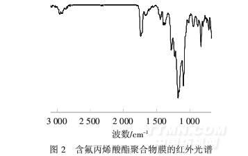 圖2表明,1 185 cm-1和1 103 cm-1附近有很強的吸收峰,其為C—F伸縮振動的特征峰;在1 287 cm-1附近有C—O伸縮振動峰;1 742 cm-1附近較強的吸收峰為C O特征吸收峰;在2 964和1 383 cm-1附近為亞甲基和甲基的特征吸收峰.表明乳液中聚合物為三種丙烯酸酯聚合物.