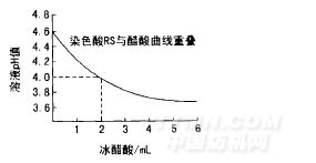 在100mL各含染色酸RS和冰醋酸pH值為4.6的溶液中分別加入一定體積0.025M燒堿或0.25%冰醋酸,測(cè)定溶液pH值的變化,結(jié)果如圖1、2所示。