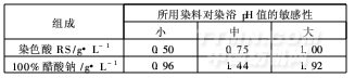 實際生產(chǎn)中,外界將酸帶入染浴的幾率很小,主要是帶入堿。測試結(jié)果表明,以上用量、濃度組成的緩沖溶液,在常規(guī)情況下,足以消除外界帶入的酸堿性物質(zhì)對染浴pH值的影響,可確保染浴pH值的穩(wěn)定,提高染色重現(xiàn)性。